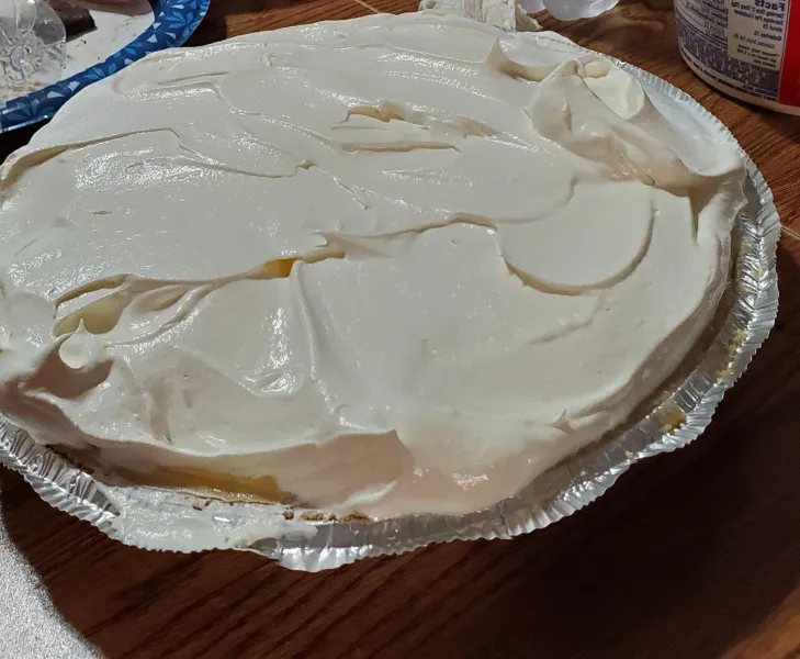 Rozłóż bezę na wierzchu ciasta Posyp pozostałą mieszanką masła orzechowego i cukru pudru.