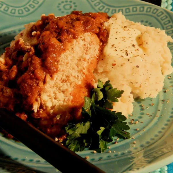 W blenderze wymieszaj zupę, serek, dressing i wino Wymieszaj do uzyskania gładkiej konsystencji, a następnie polej kurczakiem.
