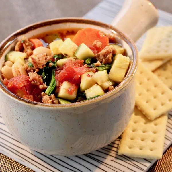 Wlej bulion drobiowy; dodaj kiełbasę i ziemniaki i ponownie zagotuj.