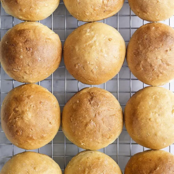 Precalentar el horno a 180 grados C. Hornear los panes durante unos 25-30 minutos o hasta que estén dorados y cocidos por completo. Sacar del horno y dejar enfriar antes de servir.