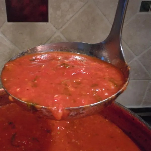 En una olla grande a fuego medio, combine la salsa de tomate y los tomates guisados; llevar a ebullición y luego reducir el fuego. Cocine la salsa a fuego lento durante 15 minutos.